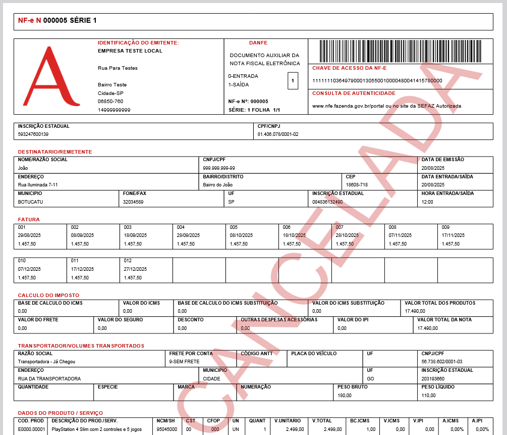 Após confirmar, será aberto o pdf com os detalhes da nota cancelada, abaixo a prévia de como ficou:
